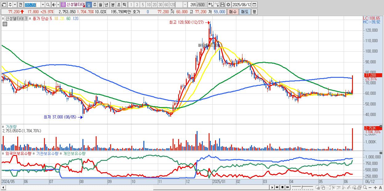 - 신성델타테크 (72,500원 ▲ 22.05% , 시총: 19,926억, 거래량: 1,392,725, 거래대금:982억)