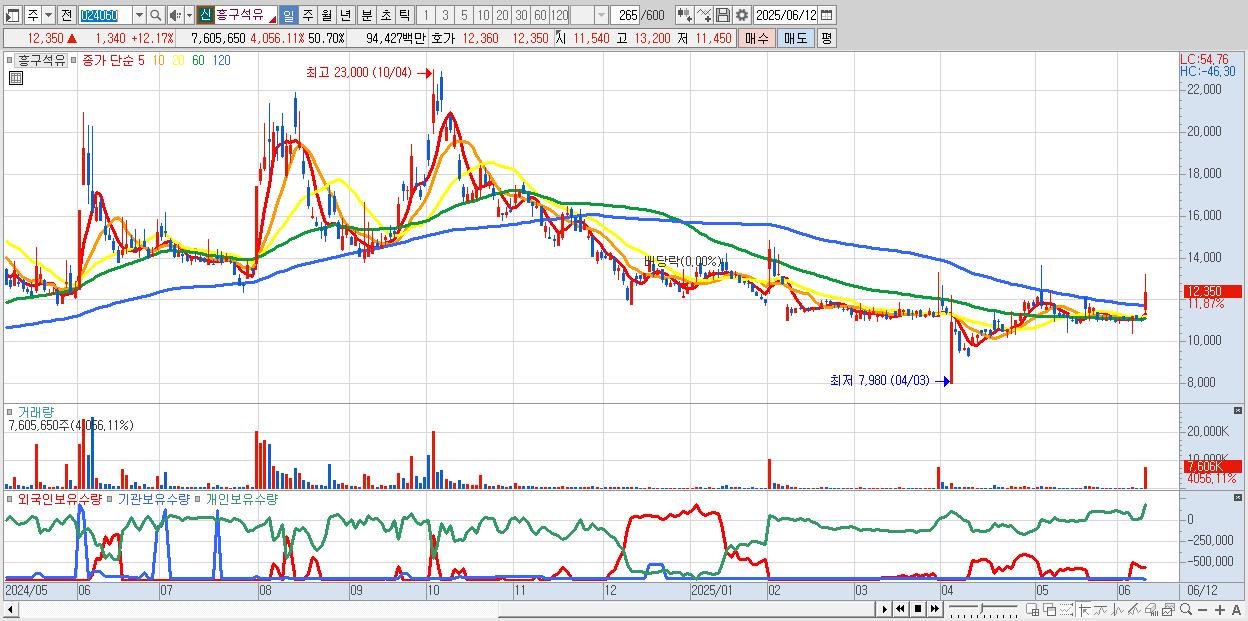 - 흥구석유 (12,280원 ▲ 11.53% , 시총: 1,842억, 거래량: 2,696,410, 거래대금:333억)