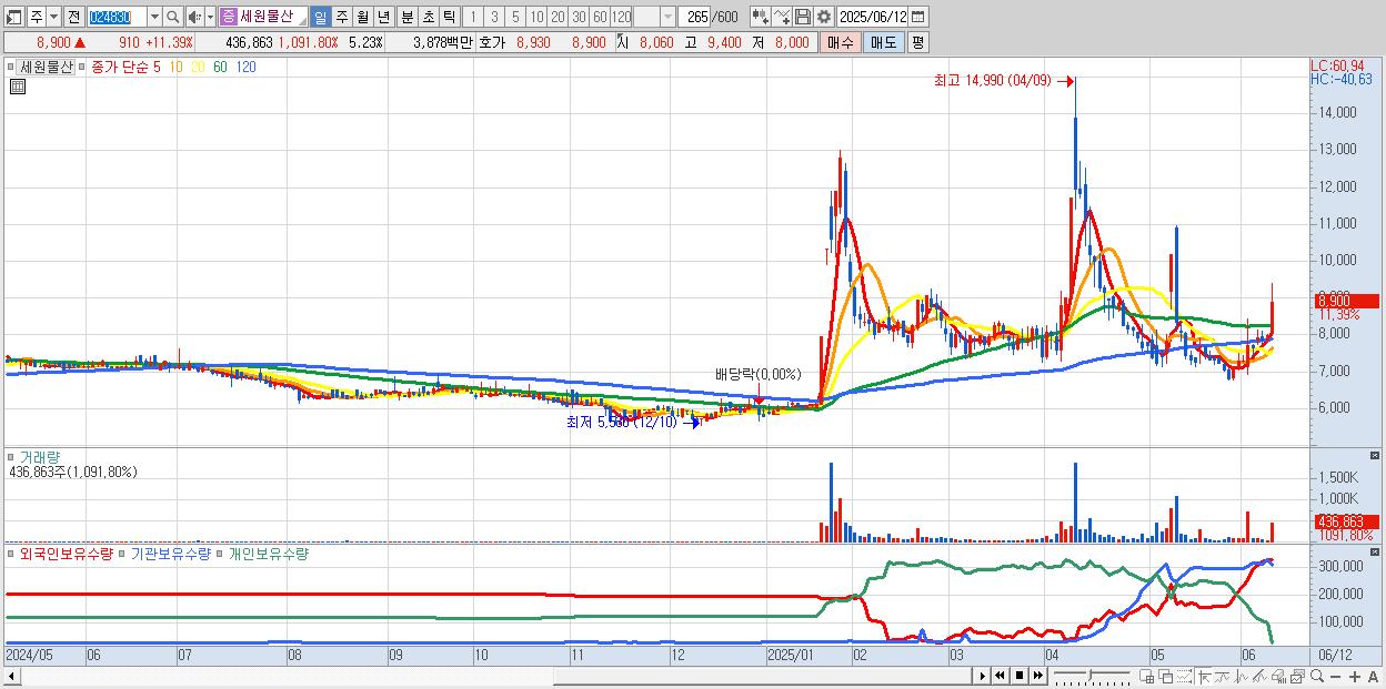 - 세원물산 (8,900원 ▲ 11.39% , 시총: 743억, 거래량: 436,863, 거래대금:39억)