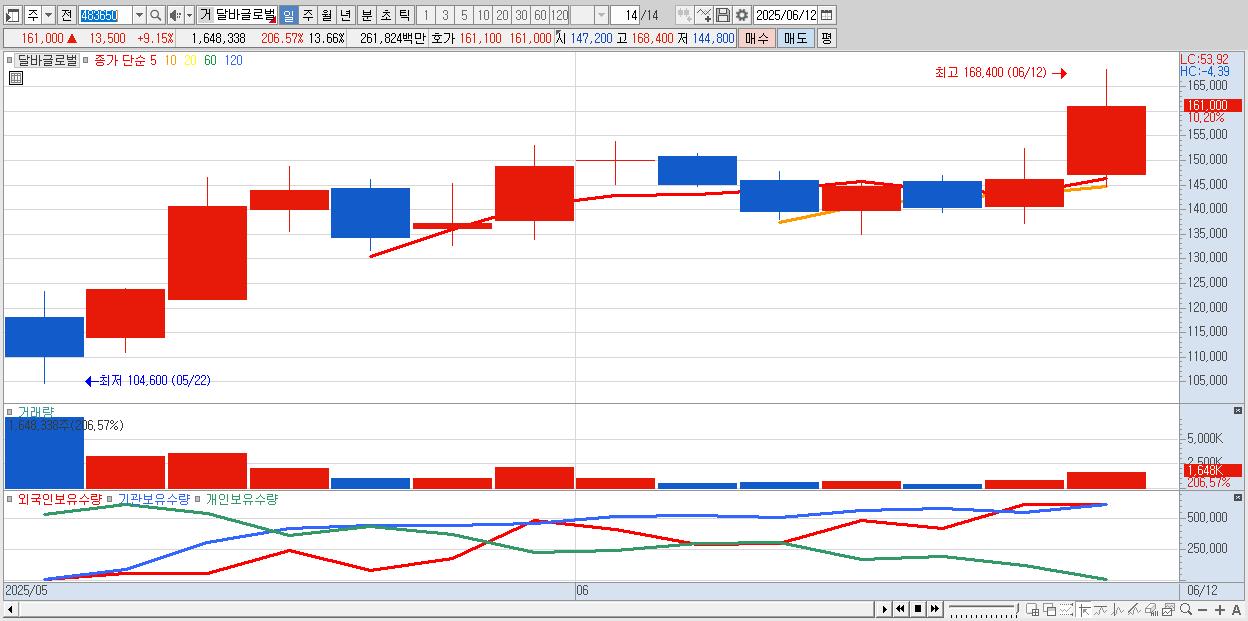 - 달바글로벌 (164,600원 ▲ 11.59% , 시총: 19,867억, 거래량: 1,040,195, 거래대금:1,652억)