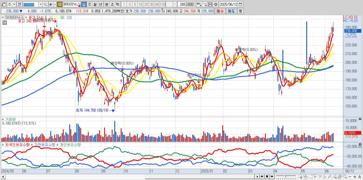 - SK하이닉스 (235,500원 ▼ -1.88% , 시총: 1,714,446억, 거래량: 4,994,238, 거래대금:11,941억)