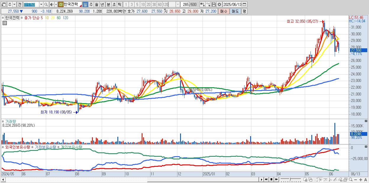- 한국전력 (27,450원 ▼ -3.51% , 시총: 176,219억, 외국인 순매수 거래금:193억)