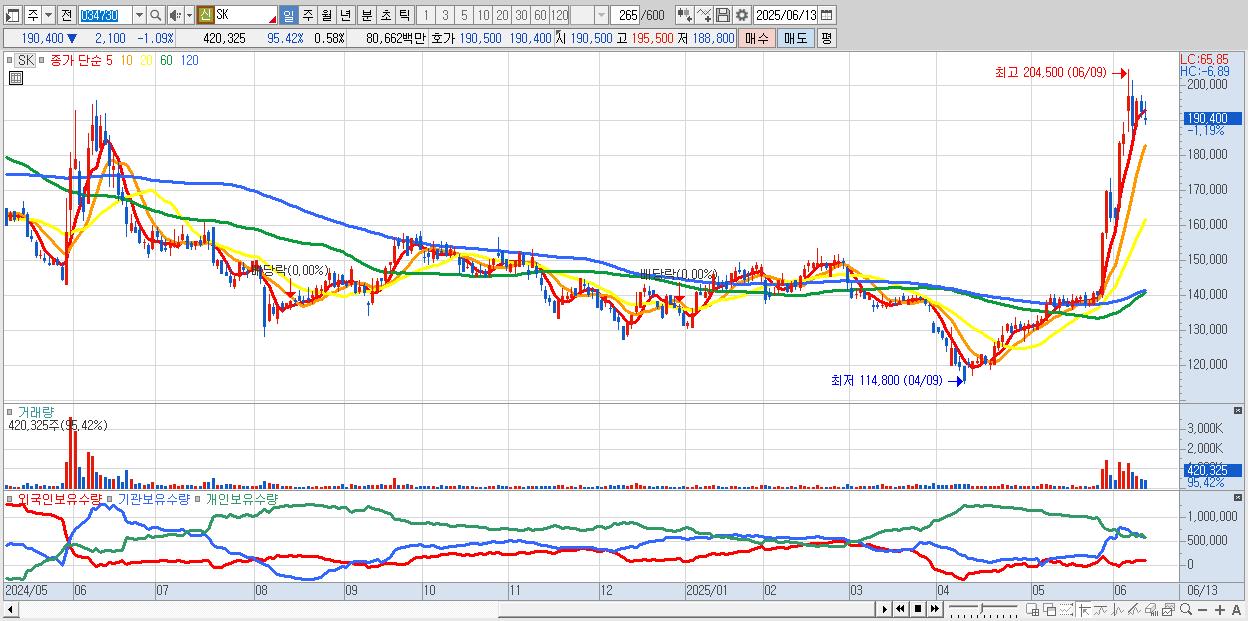- SK (190,600원 ▼ -0.99% , 시총: 138,190억, 외국인 순매수 거래금:151억)