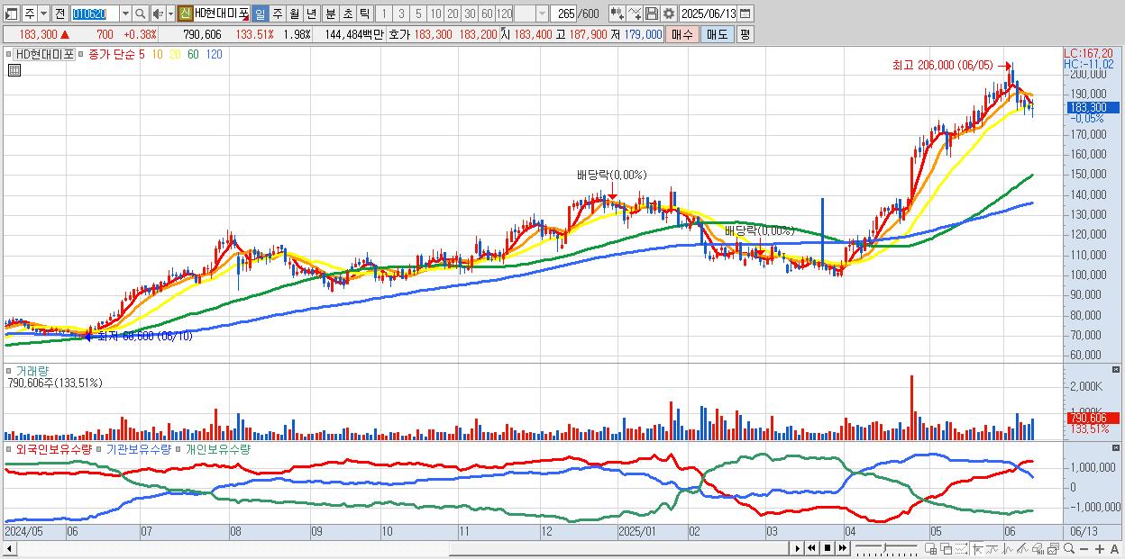 - HD현대미포 (184,000원 ▲ 0.77% , 시총: 73,494억, 외국인 순매수 거래금:381억)