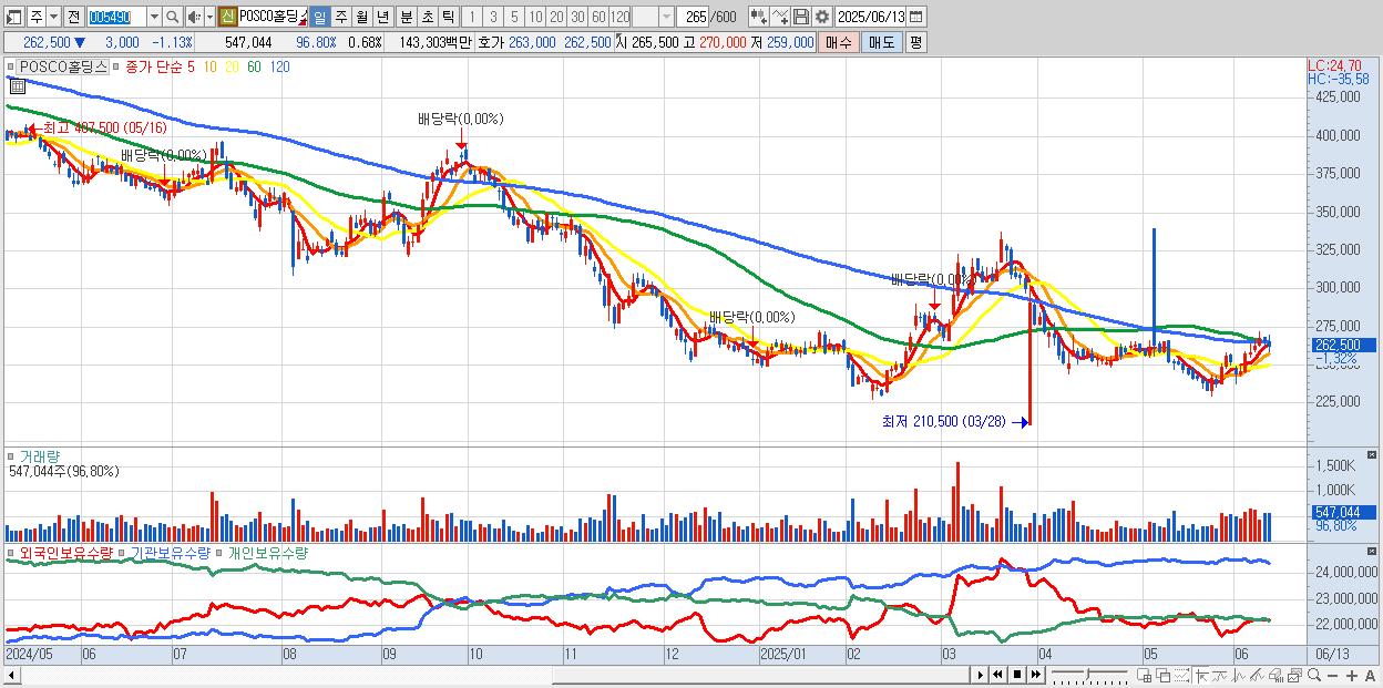 - POSCO홀딩스 (264,000원 ▼ -0.56% , 시총: 213,663억, 외국인 순매수 거래금:292억)
