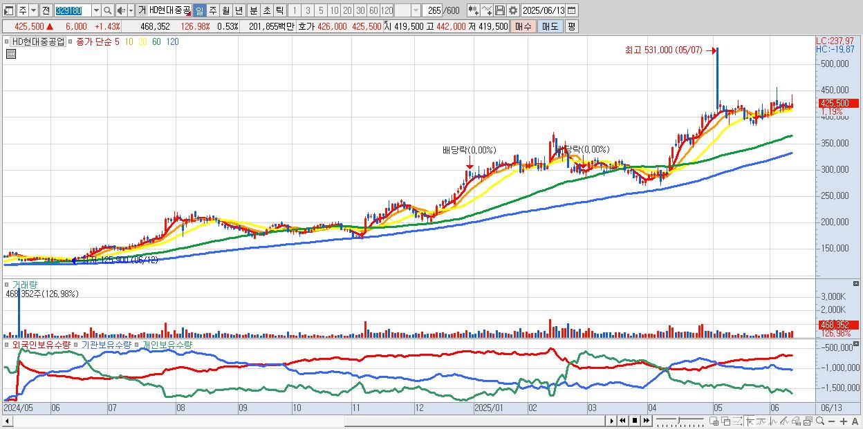 - HD현대중공업 (427,500원 ▲ 1.91% , 시총: 379,505억, 외국인 순매수 거래금:330억)