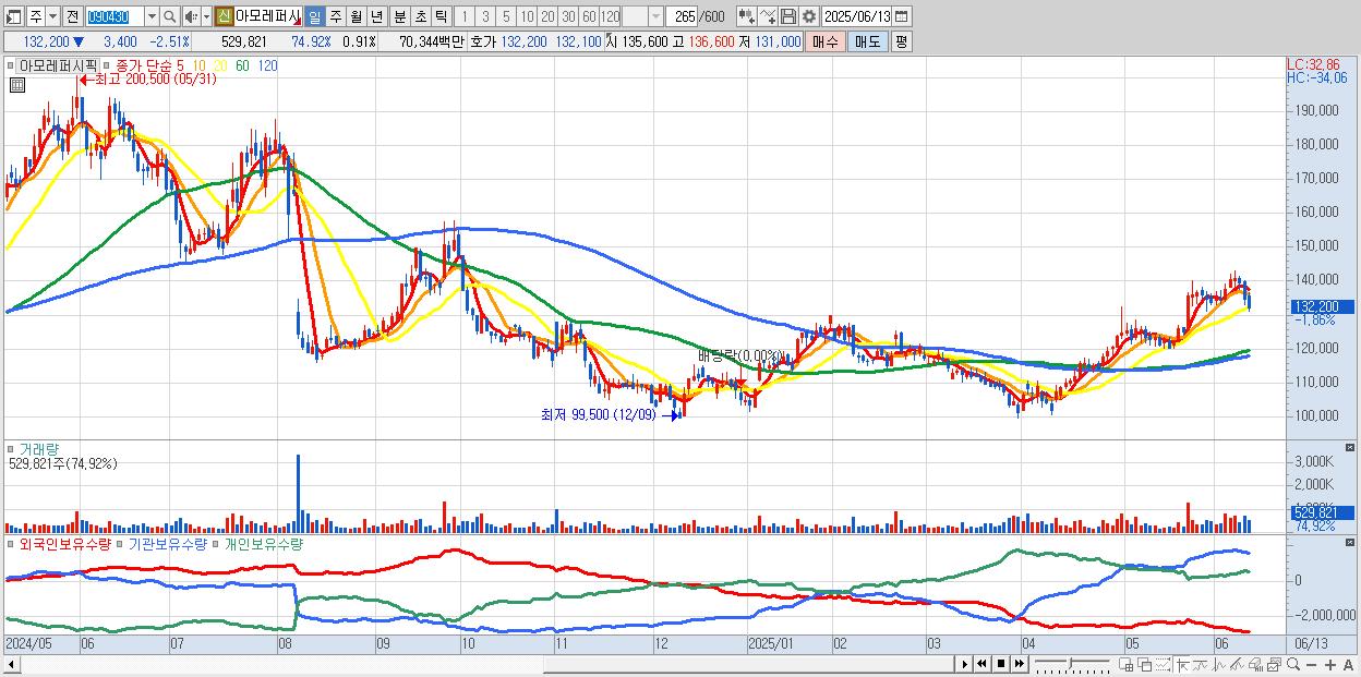 - 아모레퍼시픽 (132,300원 ▼ -2.43% , 시총: 77,386억, 외국인 순매수 거래금:111억)