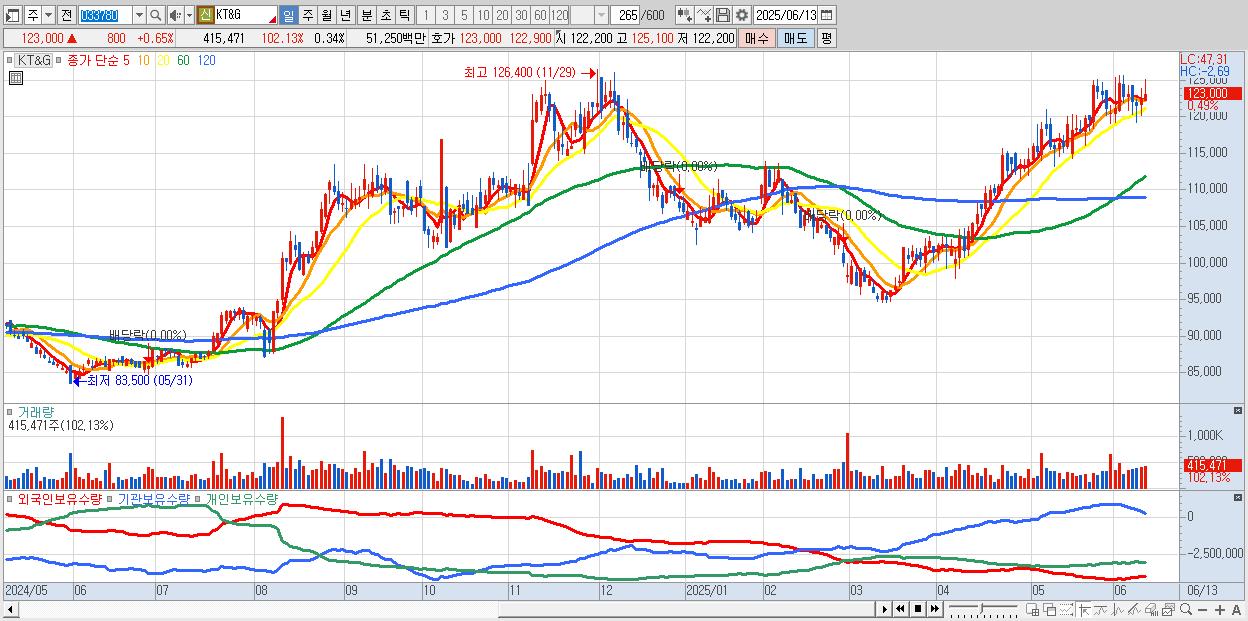- KT&G (123,200원 ▲ 0.82% , 시총: 150,381억, 외국인 순매수 거래금:121억)