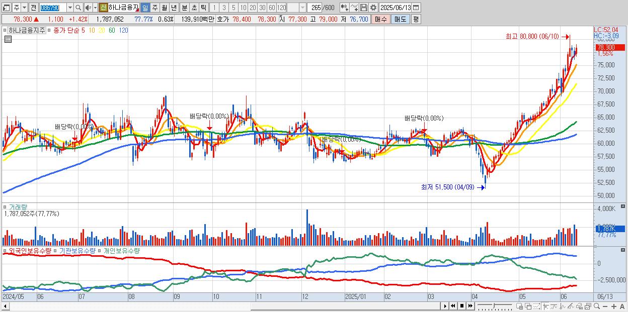 - 하나금융지주 (78,500원 ▲ 1.68% , 시총: 223,508억, 외국인 순매수 거래금:223억)