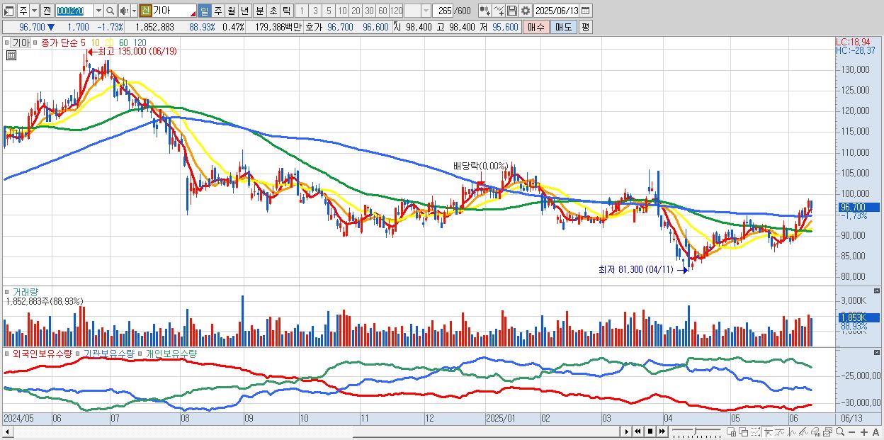 - 기아 (97,200원 ▼ -1.22% , 시총: 386,538억, 외국인 순매수 거래금:431억)