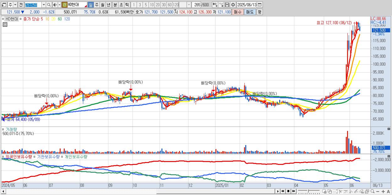 - HD현대 (121,900원 ▼ -1.3% , 시총: 96,293억, 외국인 순매수 거래금:142억)
