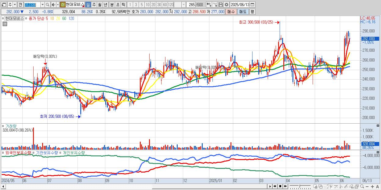 - 현대모비스 (282,000원 ▼ -0.88% , 시총: 262,246억, 외국인 순매수 거래금:235억)