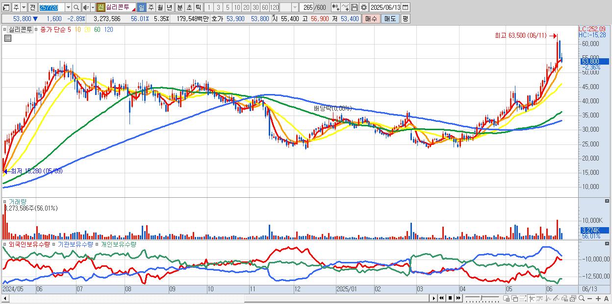 - 실리콘투 (54,100원 ▼ -2.35% , 시총: 33,094억, 외국인 순매수 거래금:119억)