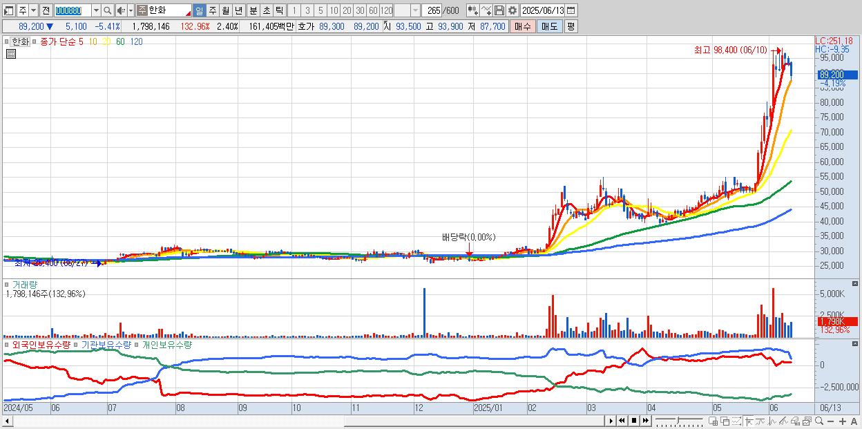 - 한화 (88,800원 ▼ -5.83% , 시총: 66,563억, 외국인 순매수 거래금:348억)