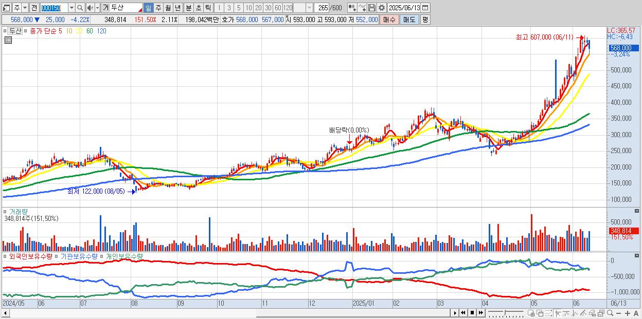 - 두산 (569,000원 ▼ -4.05% , 시총: 94,021억, 외국인 순매수 거래금:269억)