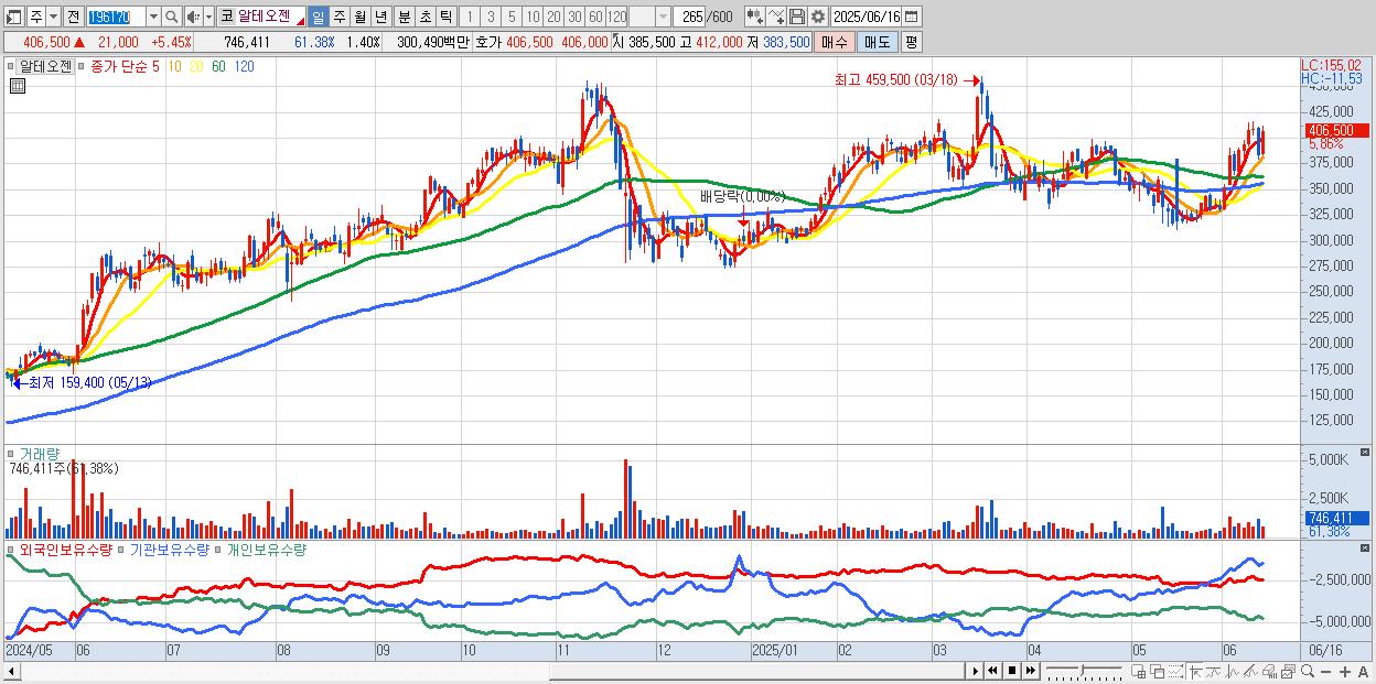 - 알테오젠 (405,500원 ▲ 5.19% , 시총: 216,800억, 외국인 순매수 거래금:401억)