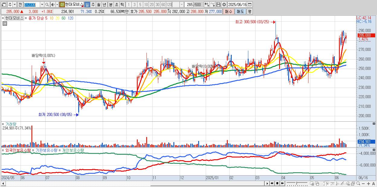 - 현대모비스 (285,500원 ▲ 1.24% , 시총: 265,501억, 외국인 순매수 거래금:118억)