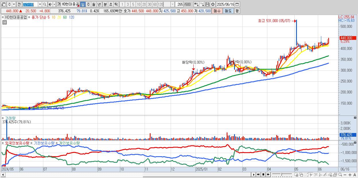 - HD현대중공업 (449,000원 ▲ 5.03% , 시총: 398,591억, 외국인 순매수 거래금:184억)