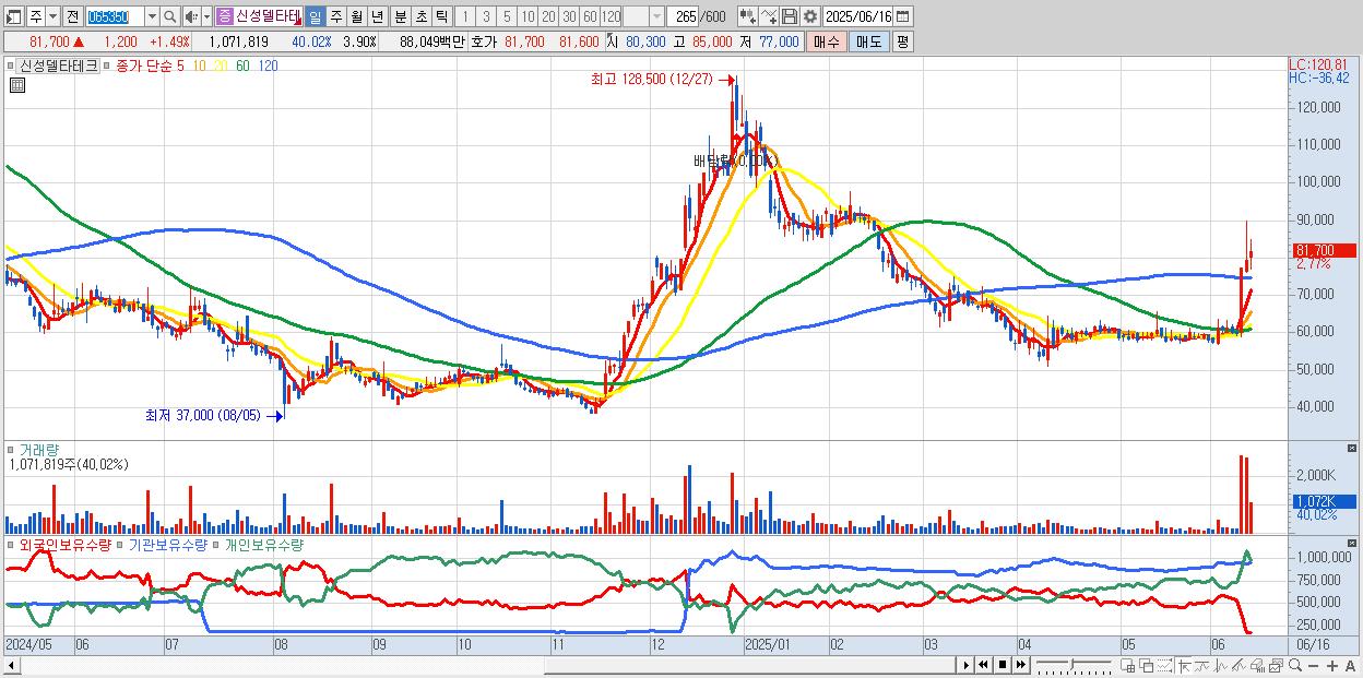 - 신성델타테크 (82,200원 ▲ 2.11% , 시총: 22,592억, 외국인 순매수 거래금:85억)