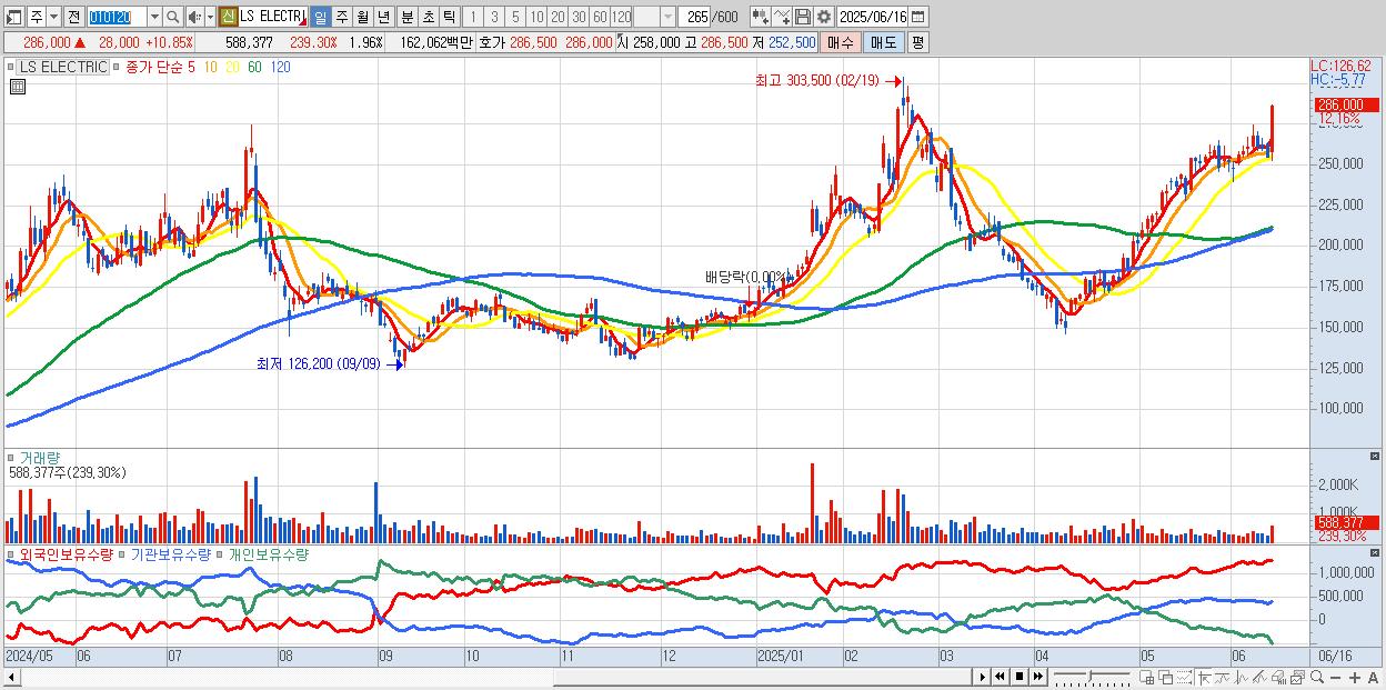 - LS ELECTRIC (286,000원 ▲ 10.85% , 시총: 85,800억, 외국인 순매수 거래금:374억)