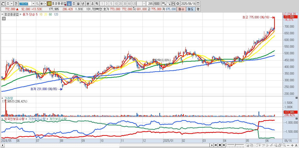- 효성중공업 (771,000원 ▲ 13.38% , 시총: 71,892억, 외국인 순매수 거래금:191억)