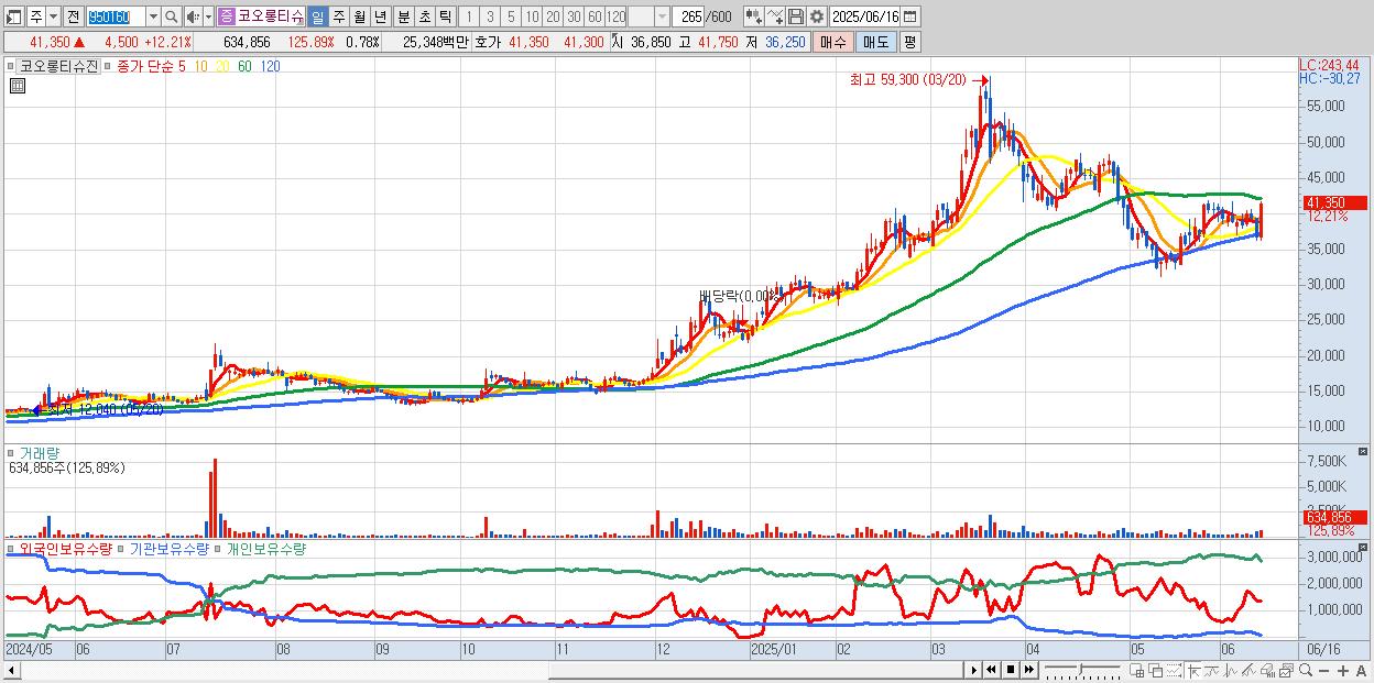 - 코오롱티슈진 (41,350원 ▲ 12.21% , 시총: 33,742억, 외국인 순매수 거래금:87억)