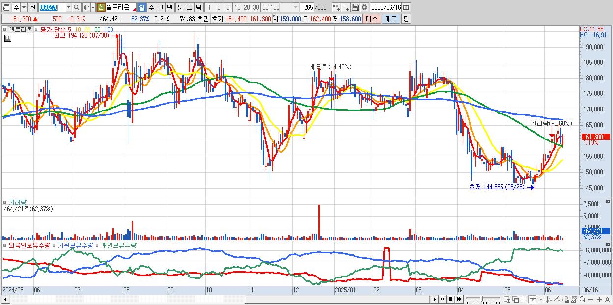 - 셀트리온 (161,800원 ▲ 0.62% , 시총: 359,885억, 외국인 순매수 거래금:69억)