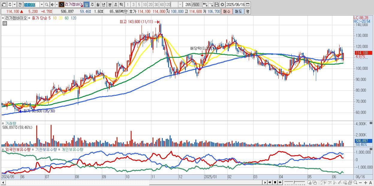 - 리가켐바이오 (114,500원 ▲ 5.14% , 시총: 41,919억, 외국인 순매수 거래금:114억)