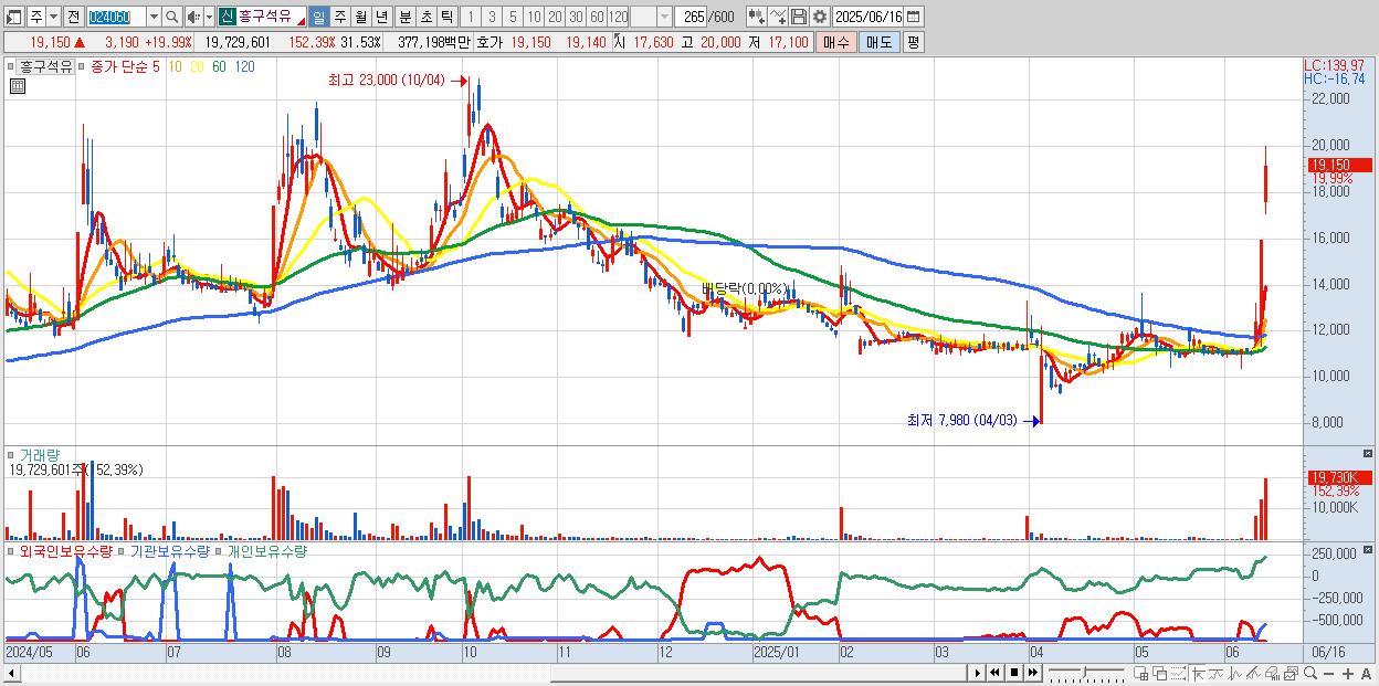 - 흥구석유 (19,170원 ▲ 20.11% , 시총: 2,876억, 거래량: 7,550,380, 거래대금:1,443억)