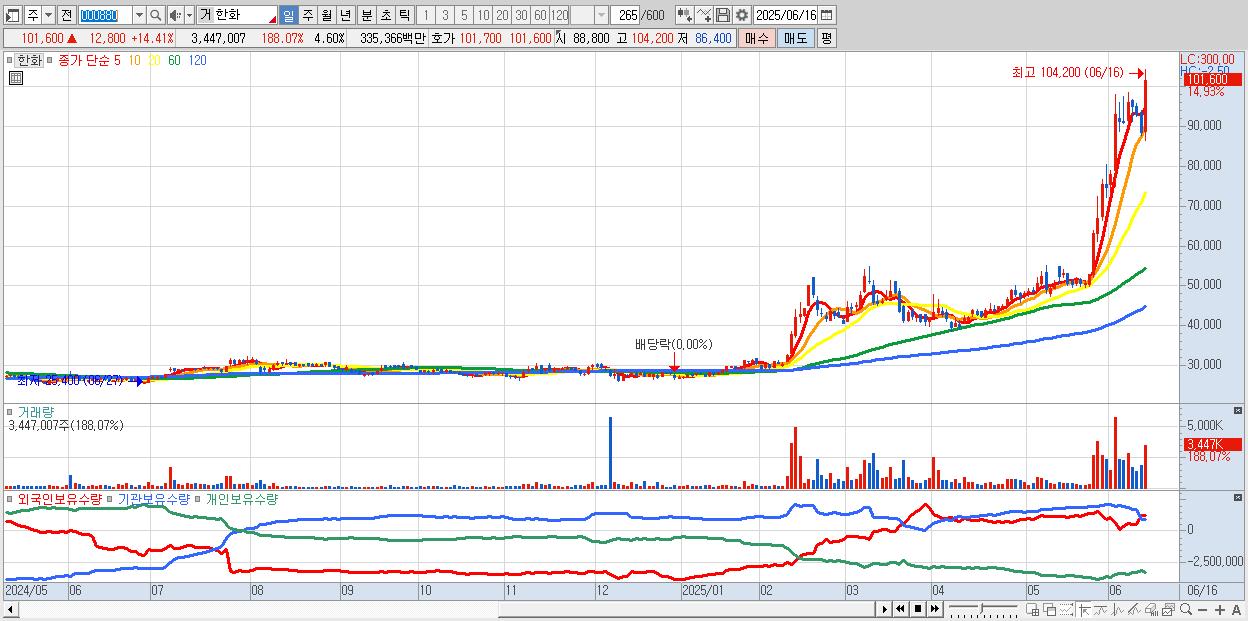 - 한화 (100,600원 ▲ 13.29% , 시총: 75,408억, 거래량: 1,753,339, 거래대금:1,698억)