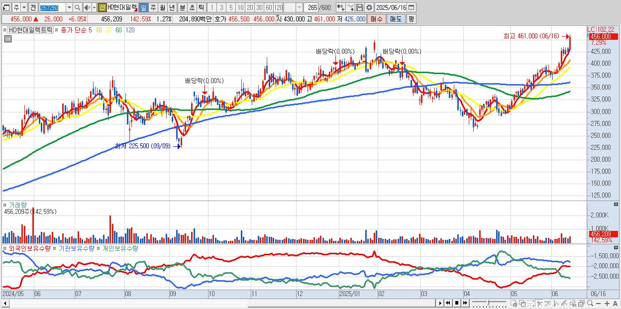 - HD현대일렉트릭 (456,500원 ▲ 6.16% , 시총: 164,555억, 거래량: 301,534, 거래대금:1,357억)