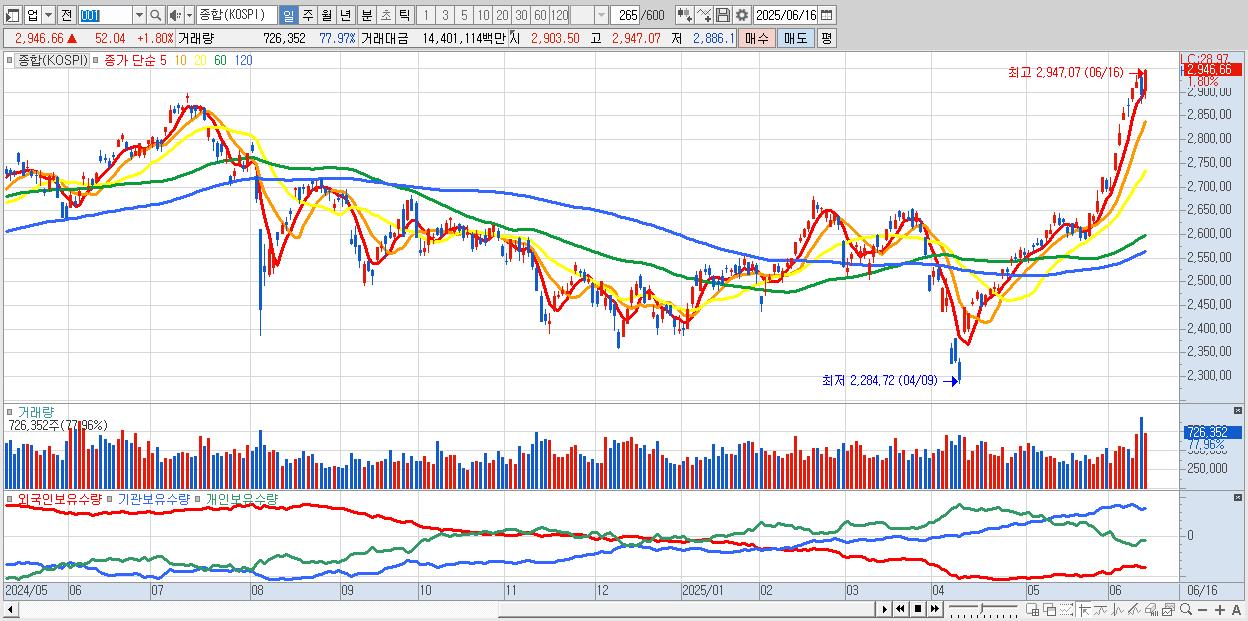 | 06/16 | 2,946.66 | ▲1.80% | 463억 | -3,224억 | 2,524억 | 237억 |