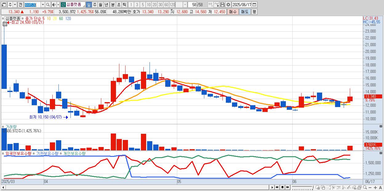 - 심플랫폼 (13,340원 ▲ 9.79% , 시총: 833억, 거래량: 3,500,972, 거래대금:483억)