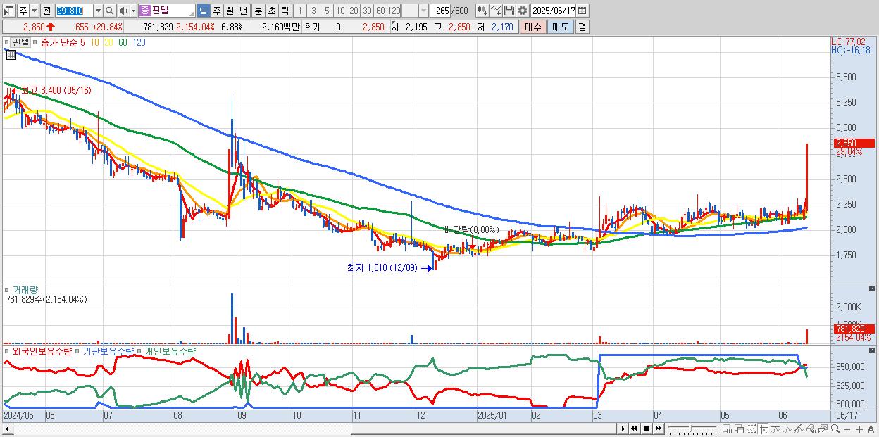 - 핀텔 (2,850원 ▲ 29.84% , 시총: 324억, 거래량: 781,829, 거래대금:22억)