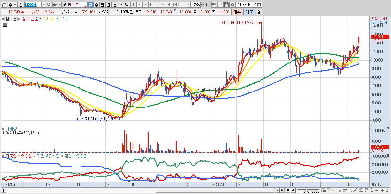 - 펨트론 (12,770원 ▲ 13.11% , 시총: 2,719억, 거래량: 606,937, 거래대금:76억)