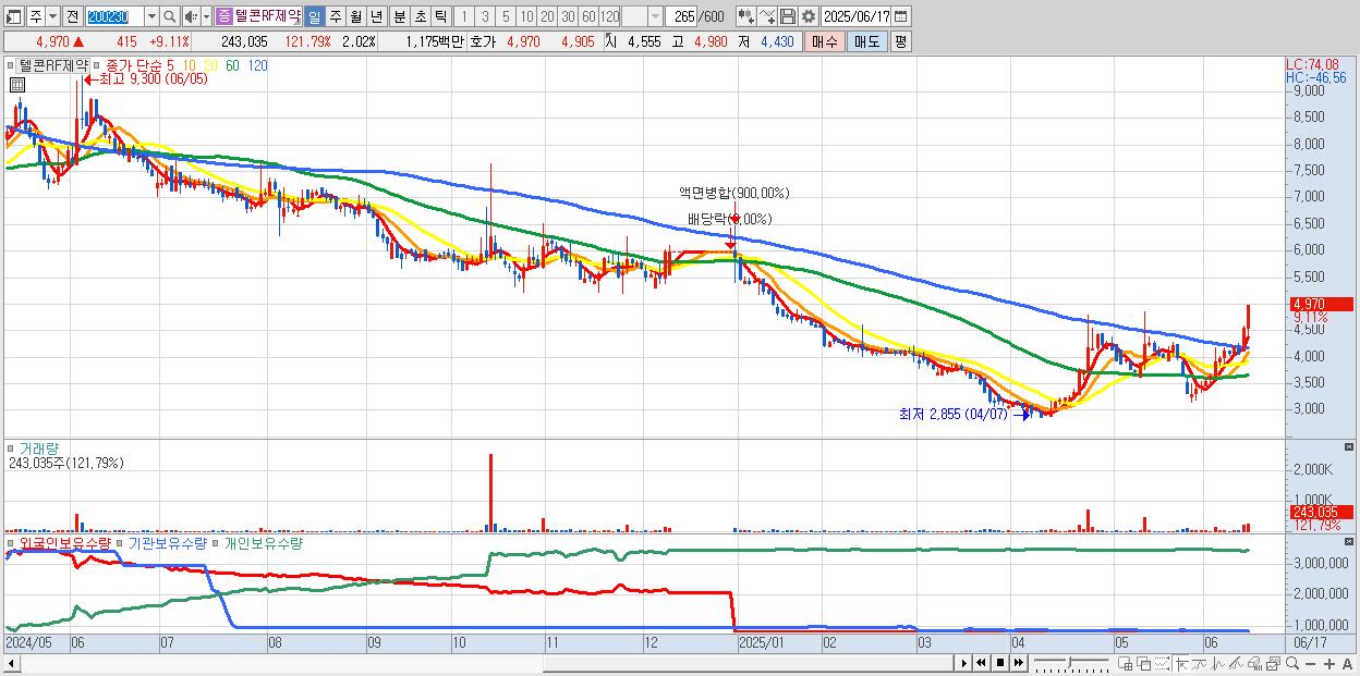 - 텔콘RF제약 (4,970원 ▲ 9.11% , 시총: 598억, 거래량: 243,035, 거래대금:12억)