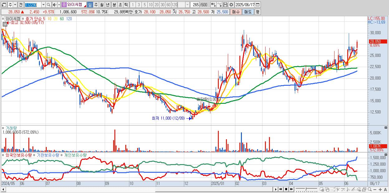 - 와이씨켐 (28,000원 ▲ 9.38% , 시총: 2,831억, 거래량: 670,783, 거래대금:185억)