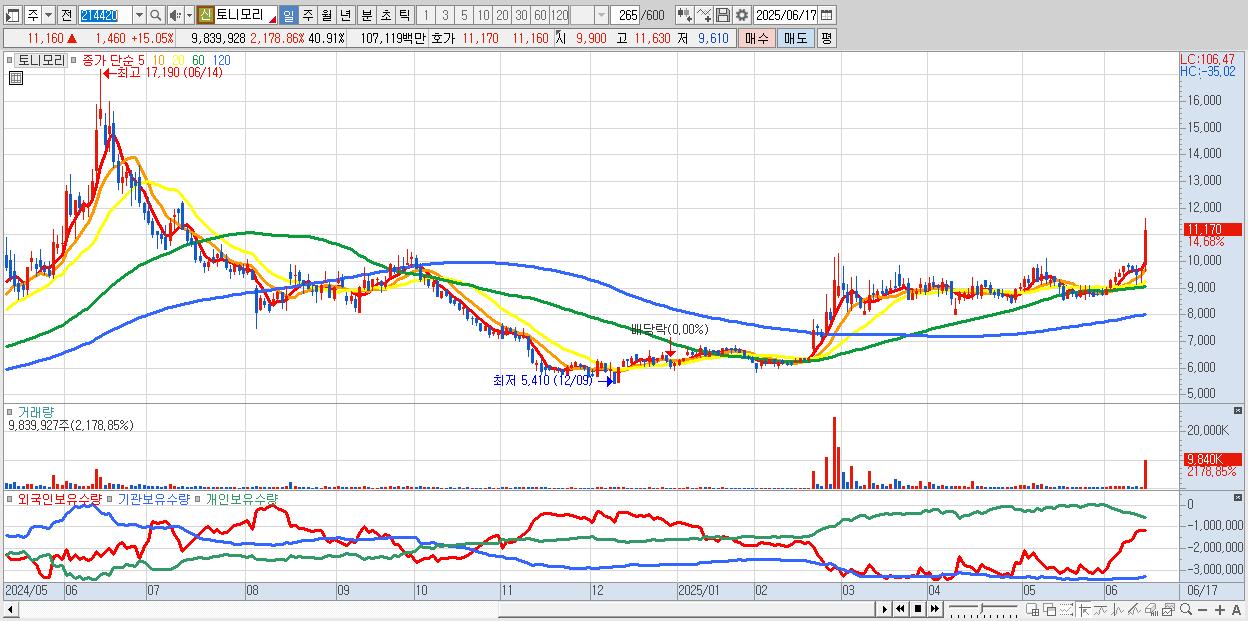 - 토니모리 (10,820원 ▲ 11.55% , 시총: 2,603억, 거래량: 3,842,058, 거래대금:410억)