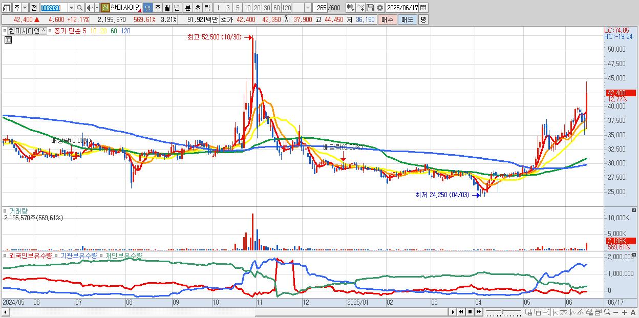- 한미사이언스 (43,900원 ▲ 16.14% , 시총: 30,024억, 거래량: 1,387,110, 거래대금:579억)