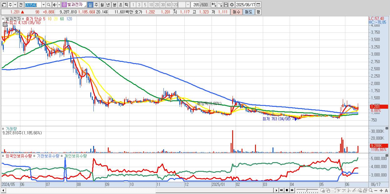 - 빛과전자 (1,201원 ▲ 8.88% , 시총: 554억, 거래량: 9,287,810, 거래대금:116억)