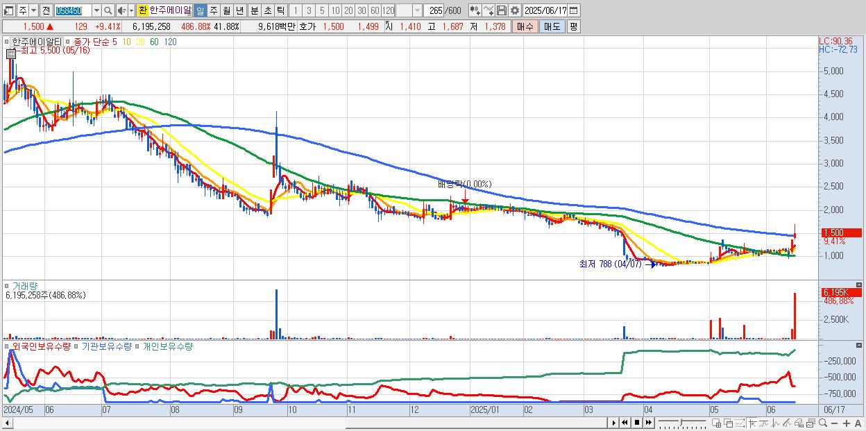 - 한주에이알티 (1,500원 ▲ 9.41% , 시총: 222억, 거래량: 6,195,258, 거래대금:96억)