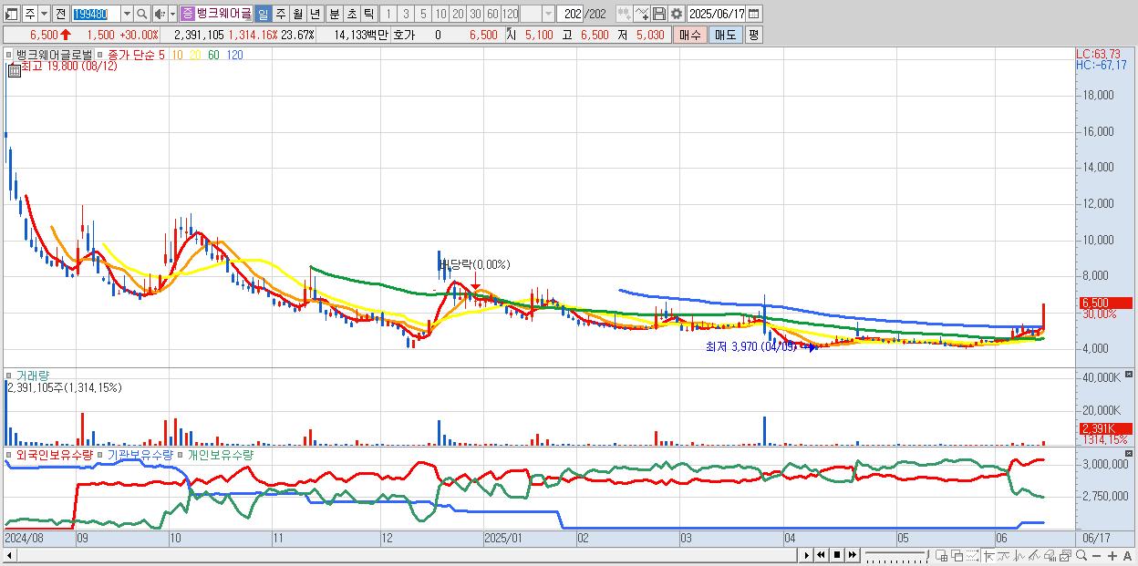 1.뱅크웨어글로벌 6,500원 ▲ 30% (KOSDAQ, 199480)