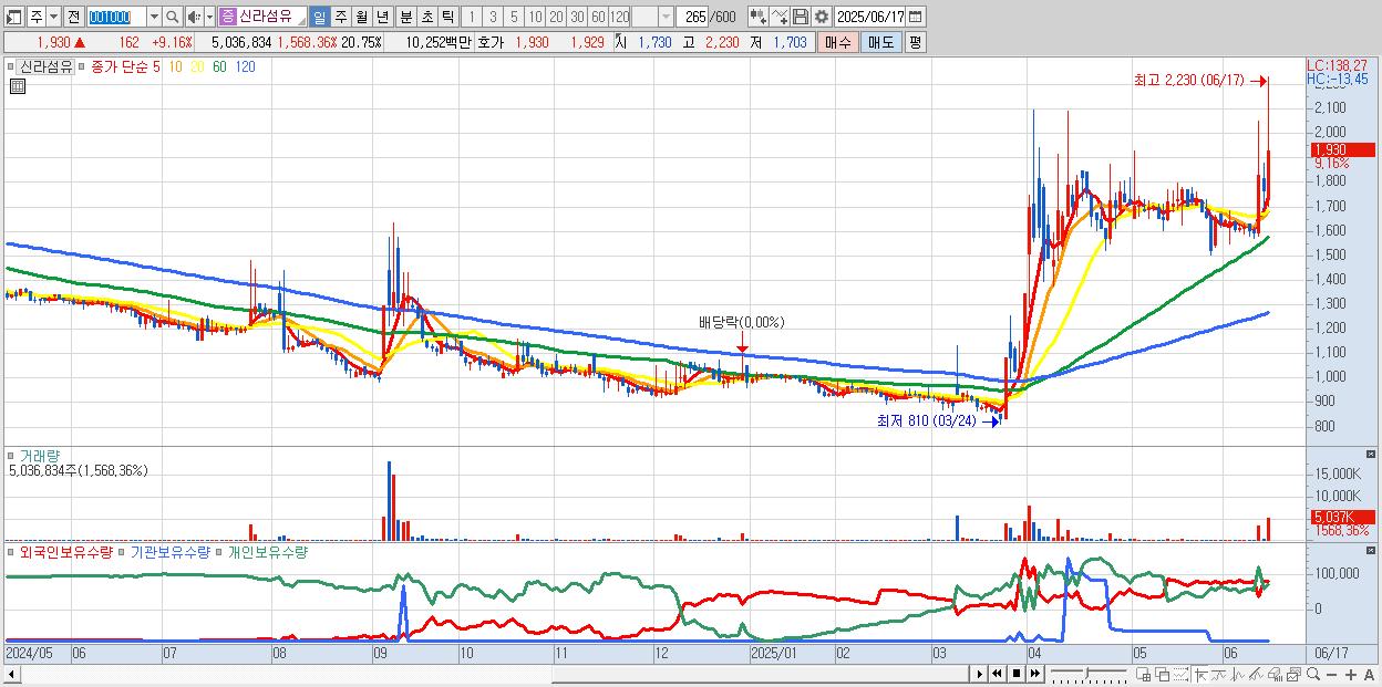 - 신라섬유 (1,930원 ▲ 9.16% , 시총: 469억, 거래량: 5,036,834, 거래대금:103억)