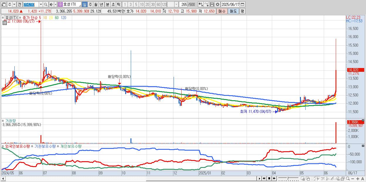 - 효성ITX (14,020원 ▲ 11.27% , 시총: 1,620억, 거래량: 3,366,265, 거래대금:495억)