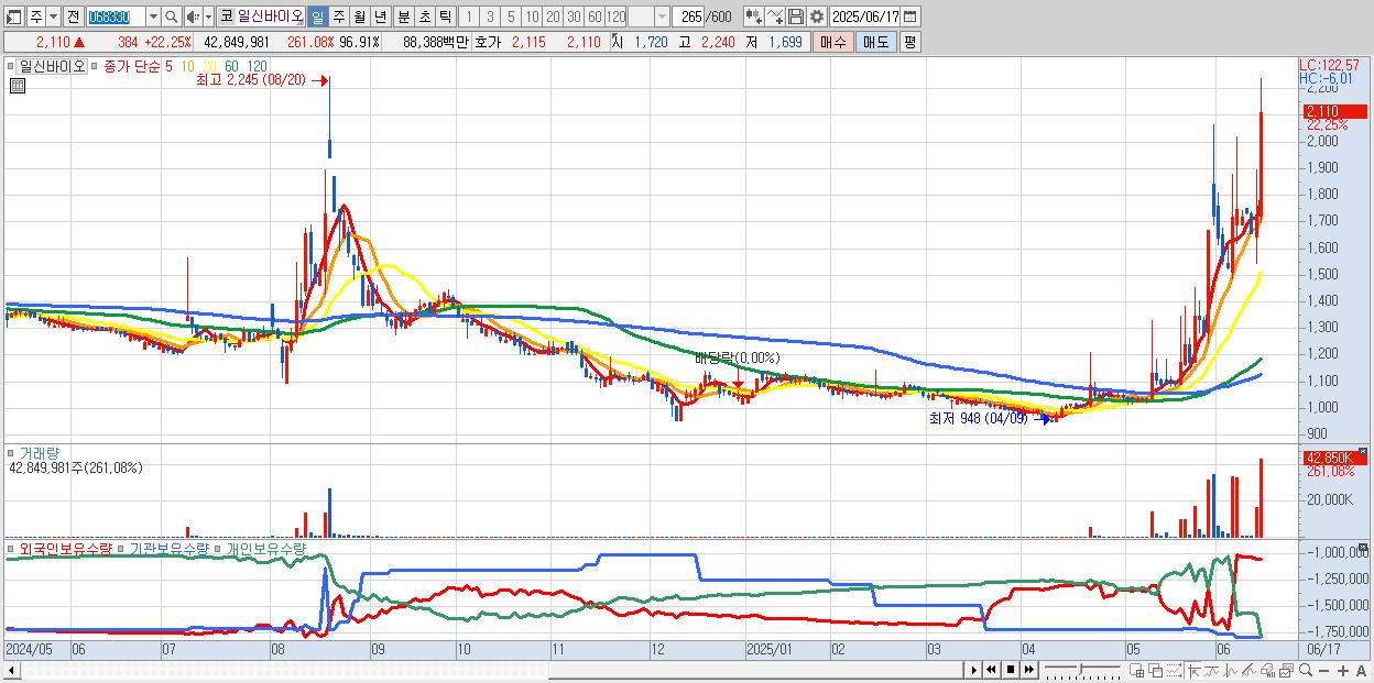 - 일신바이오 (2,110원 ▲ 22.25% , 시총: 933억, 거래량: 42,849,981, 거래대금:884억)