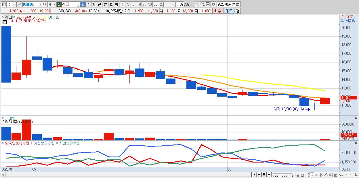 - 쎄크 (11,920원 ▲ 9.06% , 시총: 1,052억, 거래량: 938,343, 거래대금:110억)