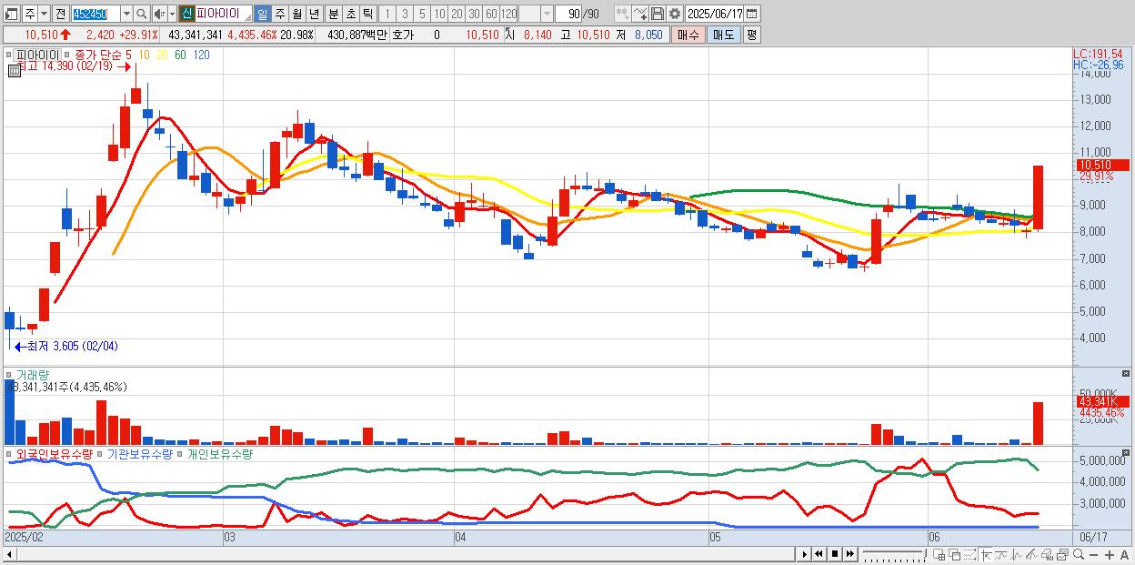 - 피아이이 (10,510원 ▲ 29.91% , 시총: 3,765억, 거래량: 43,341,341, 거래대금:4,309억)