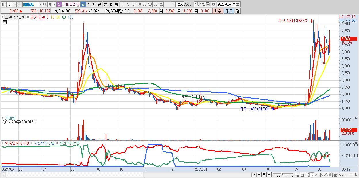 - 그린생명과학 (3,960원 ▲ 16.13% , 시총: 792억, 거래량: 9,814,780, 거래대금:392억)