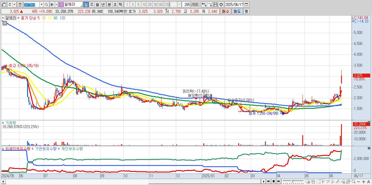 - 알체라 (3,025원 ▲ 19.09% , 시총: 1,171억, 거래량: 33,268,078, 거래대금:1,005억)