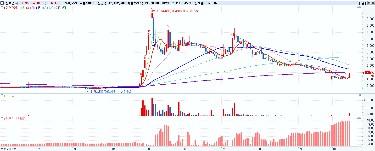 - 삼화전자 (4,955원 ▲ 19.69% , 시총: 600억, 거래량: 3,929,255, 거래대금:198억)